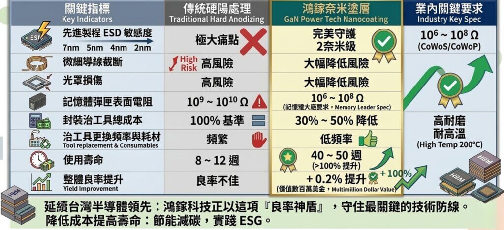 GaN Power Tech’s proprietary nano-coating technology is engineered specifically to meet these market demands. Beyond providing stable surface ESD control, it offers high wear resistance and thermal stability (up to 200°C) — properties often lacking in traditional hard-anodizing treatments.
